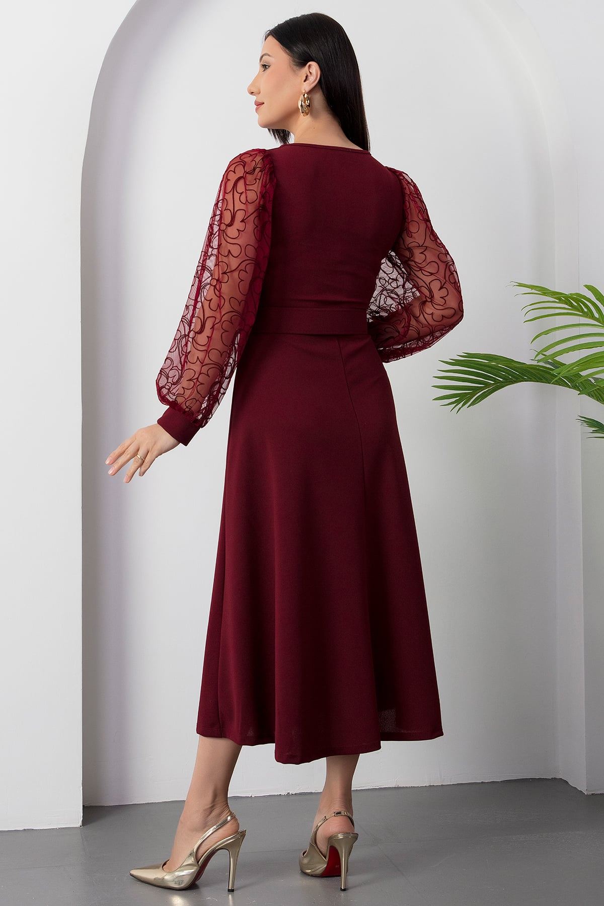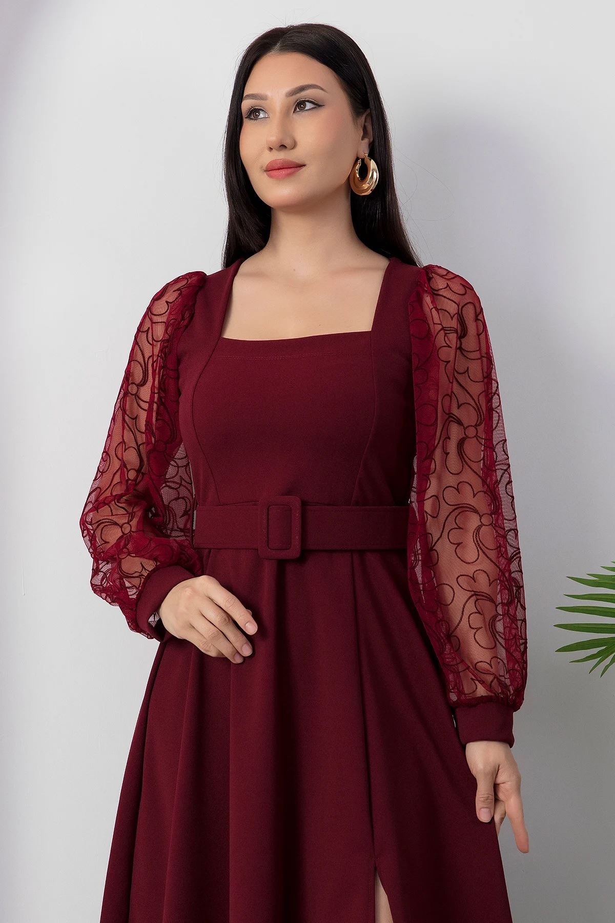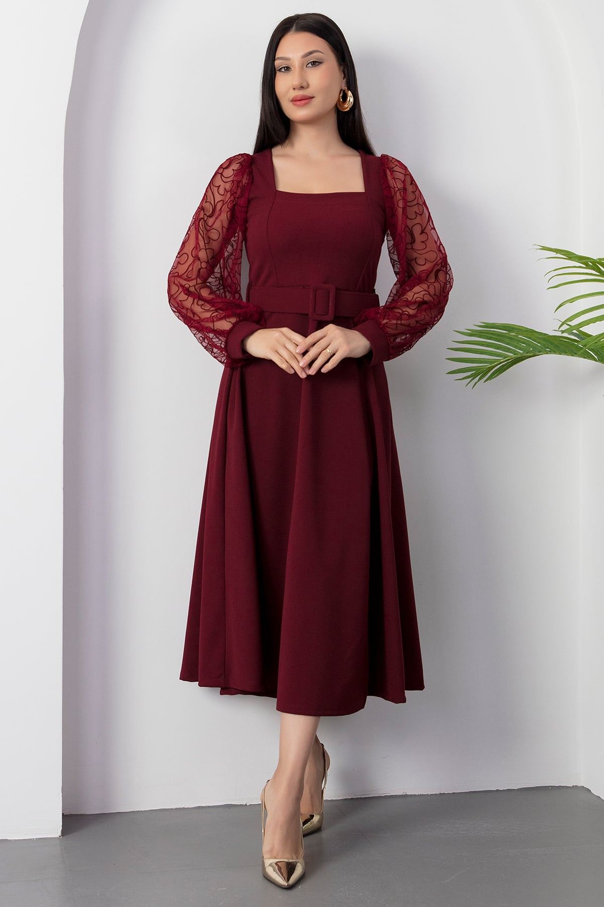 Kadın Bordo Krep Kumaş Kemerli Uzun Tül Kol Kare Yaka Midi Boy Elbise 1C-4375
