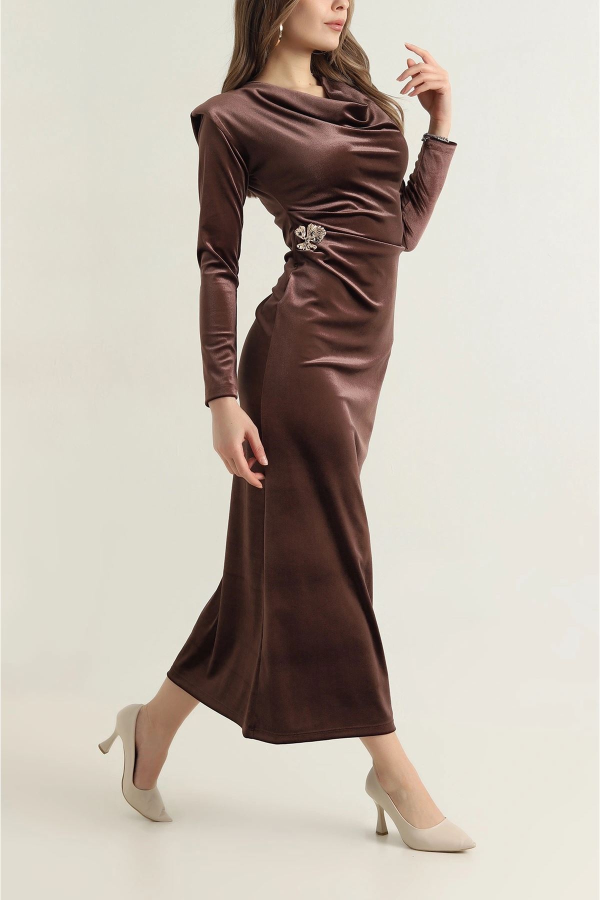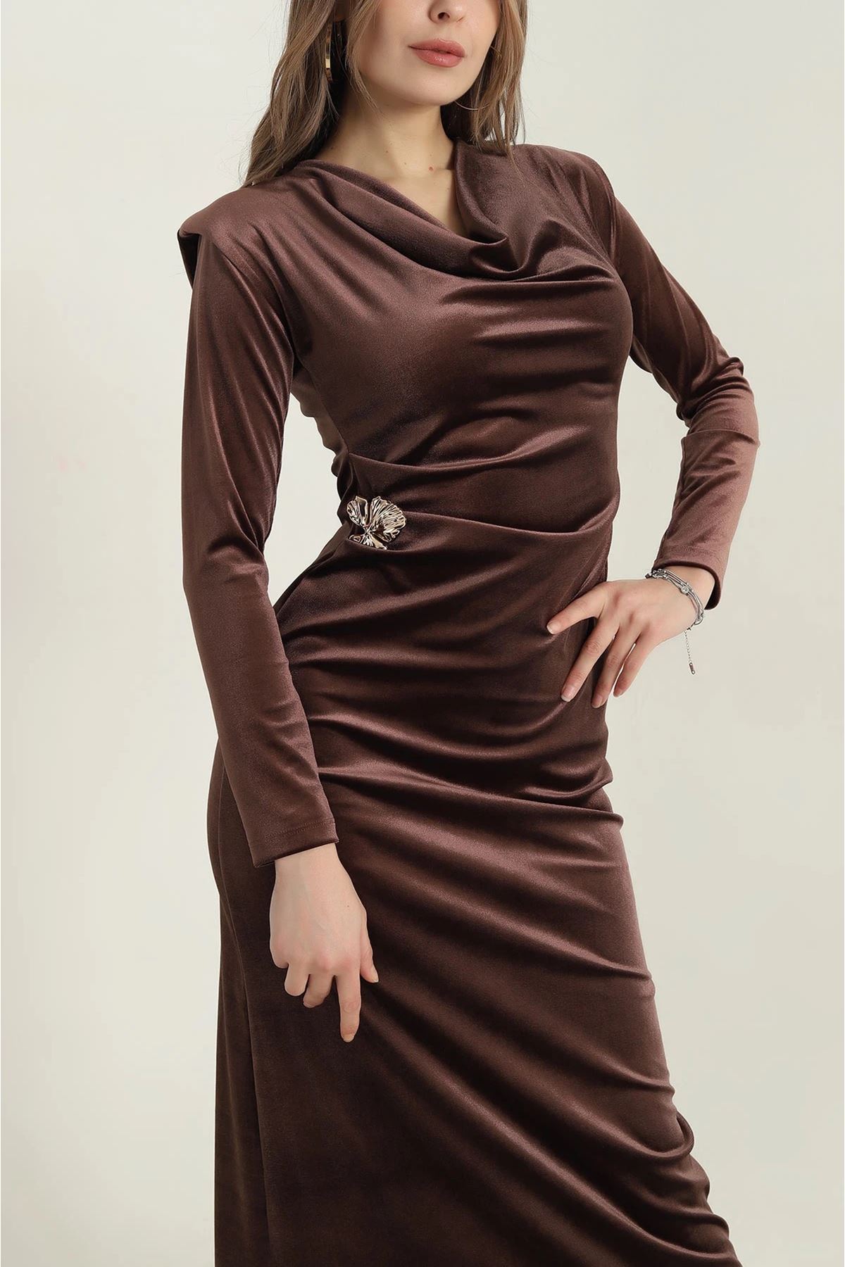 Kadın Kahverengi Kadife Vatkalı Uzun Kol Degaje Yaka Uzun Elbise 5E-4373