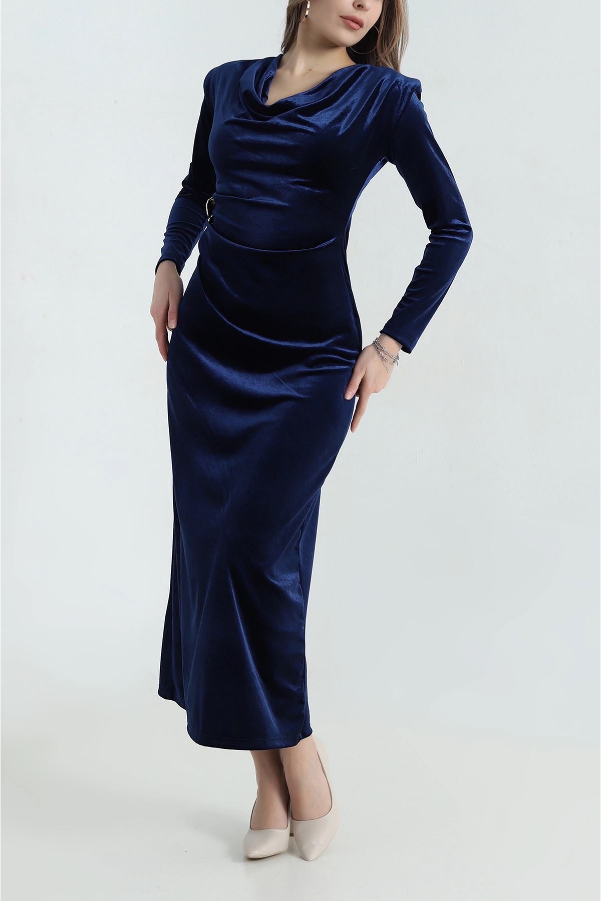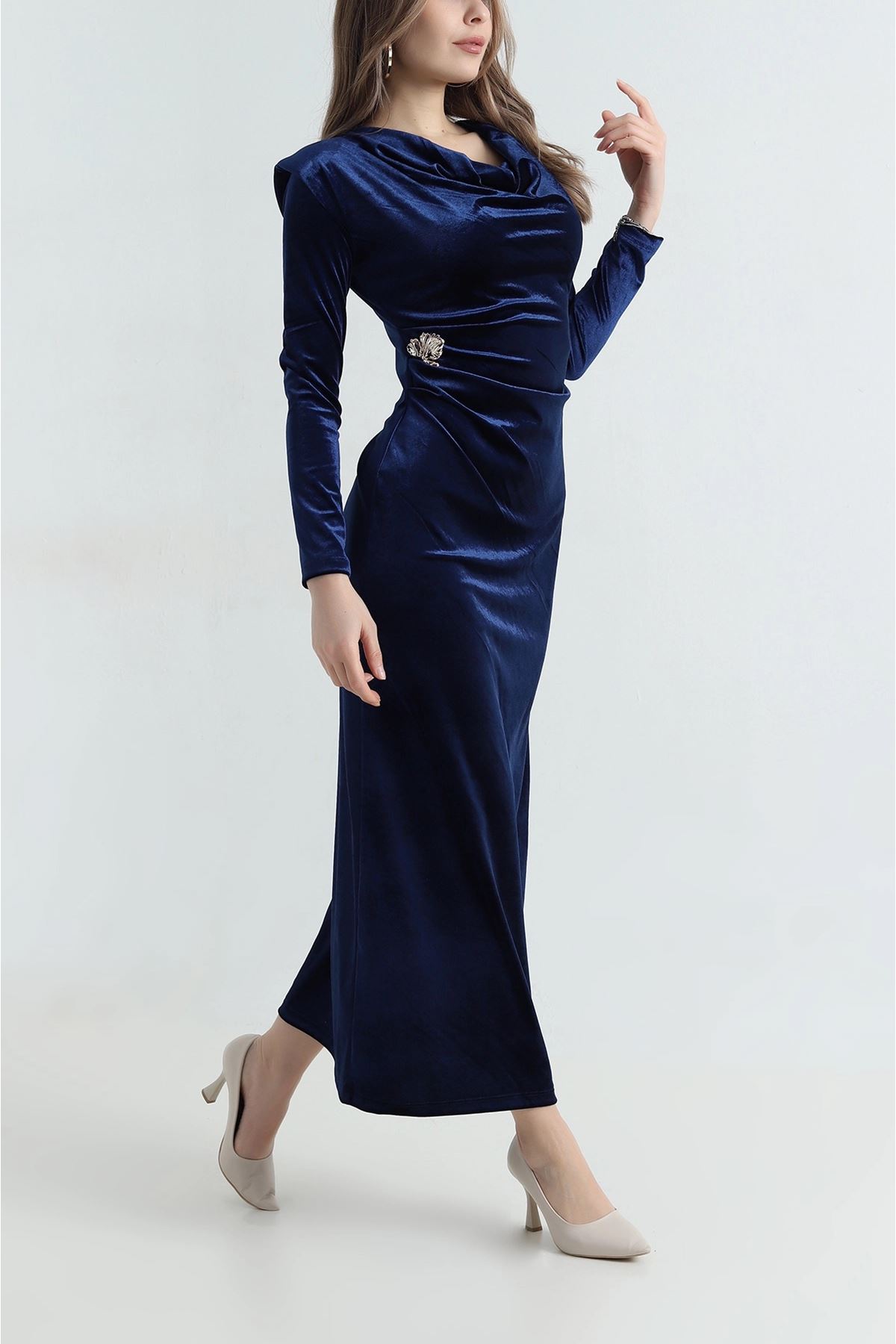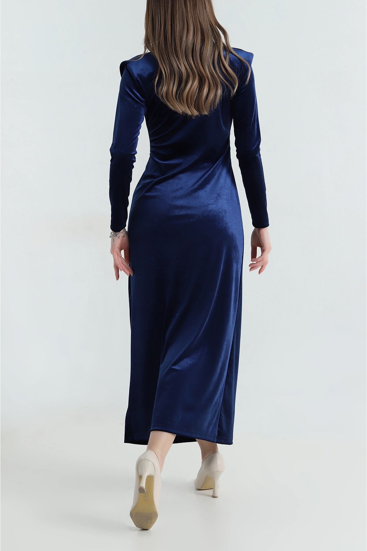 Kadın Lacivert Kadife Vatkalı Uzun Kol Degaje Yaka Uzun Elbise 5E-4372