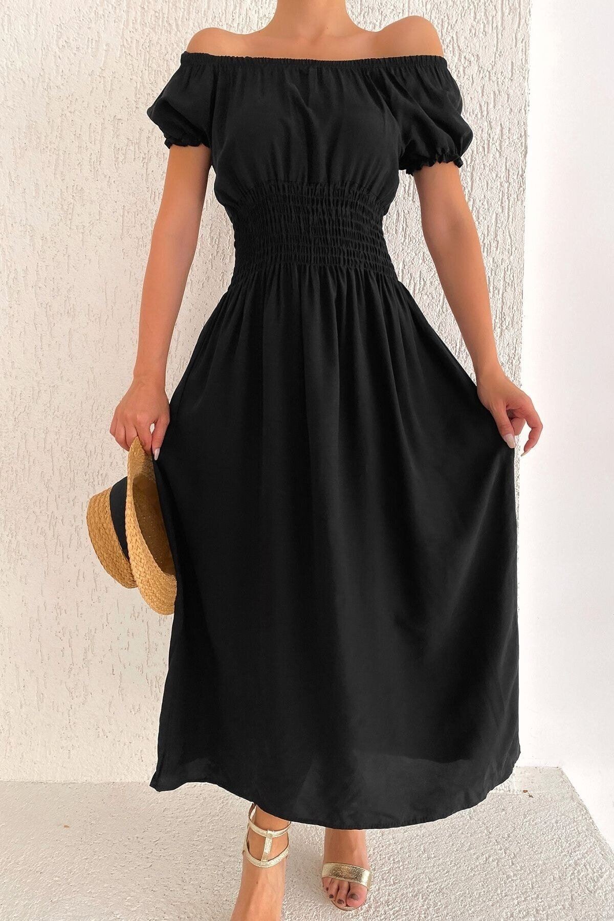 Kadın Madonna Yaka Siyah Gipeli Yazlık Elbise 12C-5050