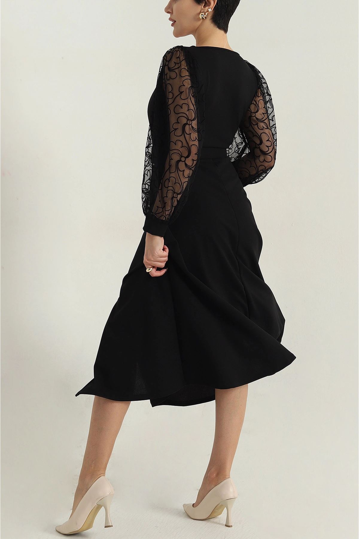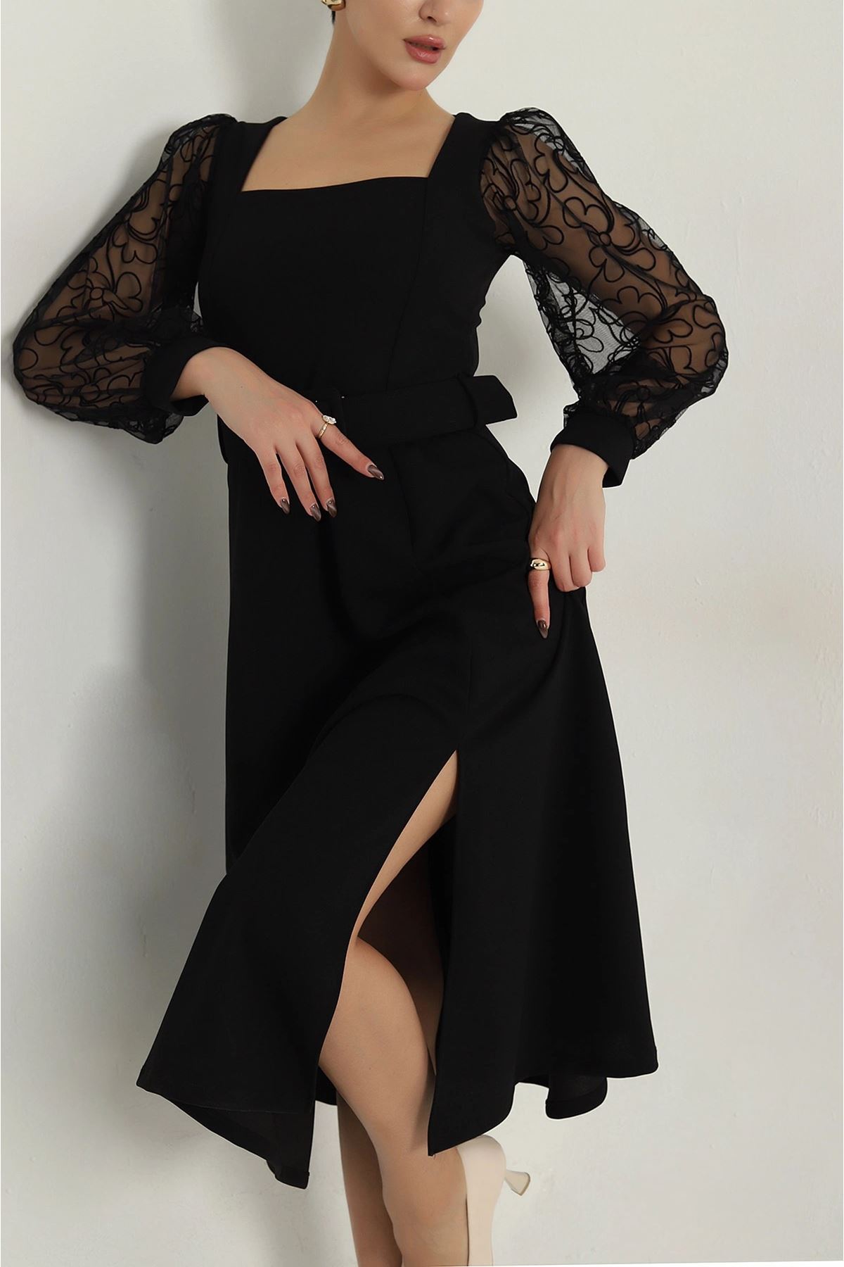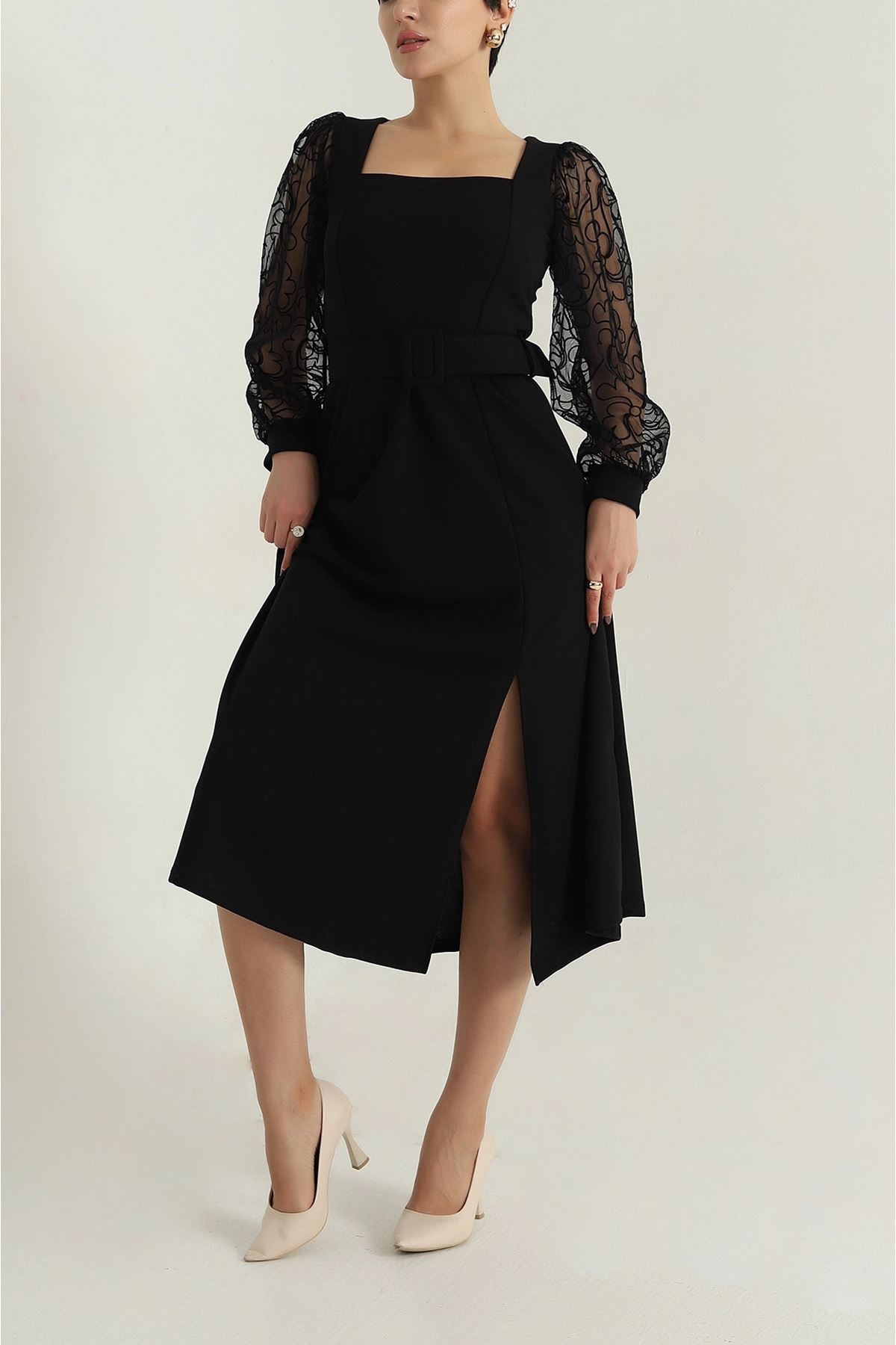 Kadın Siyah Krep Kumaş Kemerli Uzun Tül Kol Kare Yaka Midi Boy Elbise 1C-4376