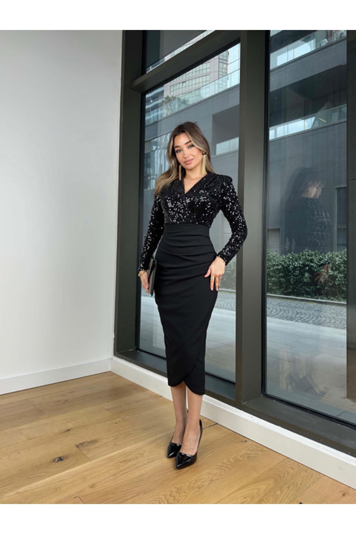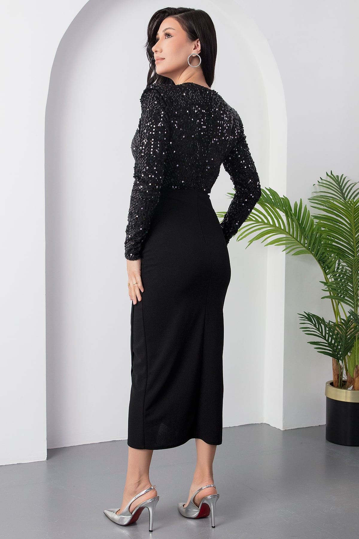 Kadın Siyah Kruvaze Yaka Uzun Kol Payetli Midi Boy Gece Elbise 8C-4377