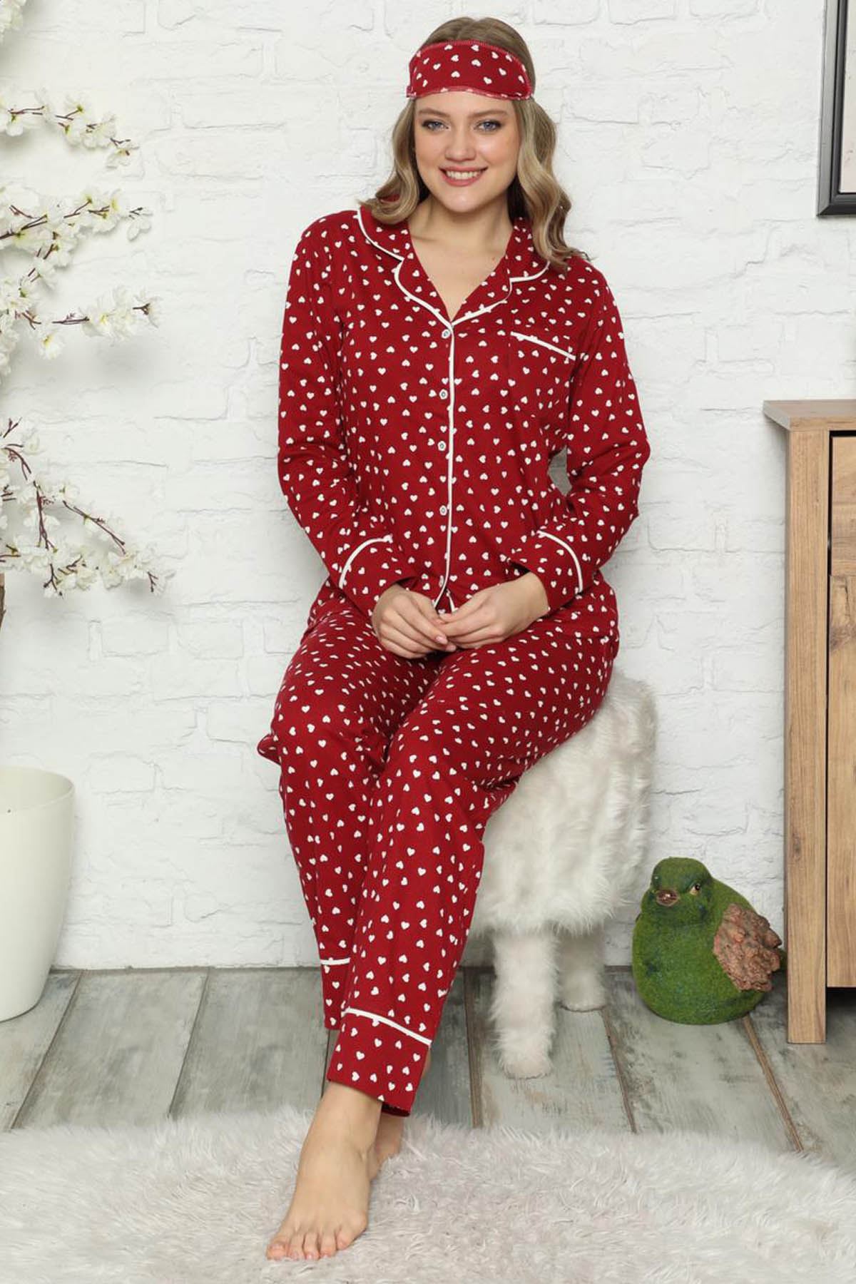 Bordo Kadın Pamuk Dokuma Uzun Kollu Pijama Takımı 8D-2500B