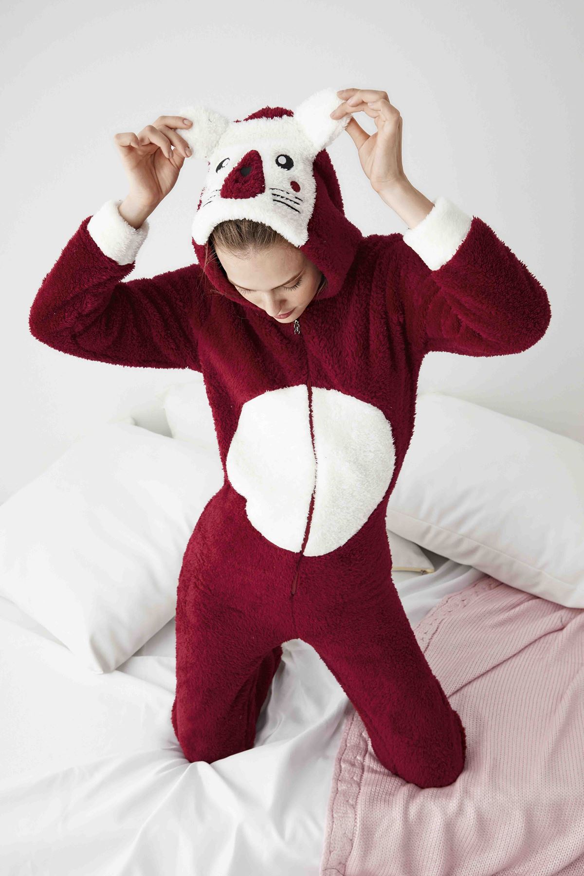 Kadın Bordo Kapüşonlu Kışlık Tam Peluş Tulum 18D-4068