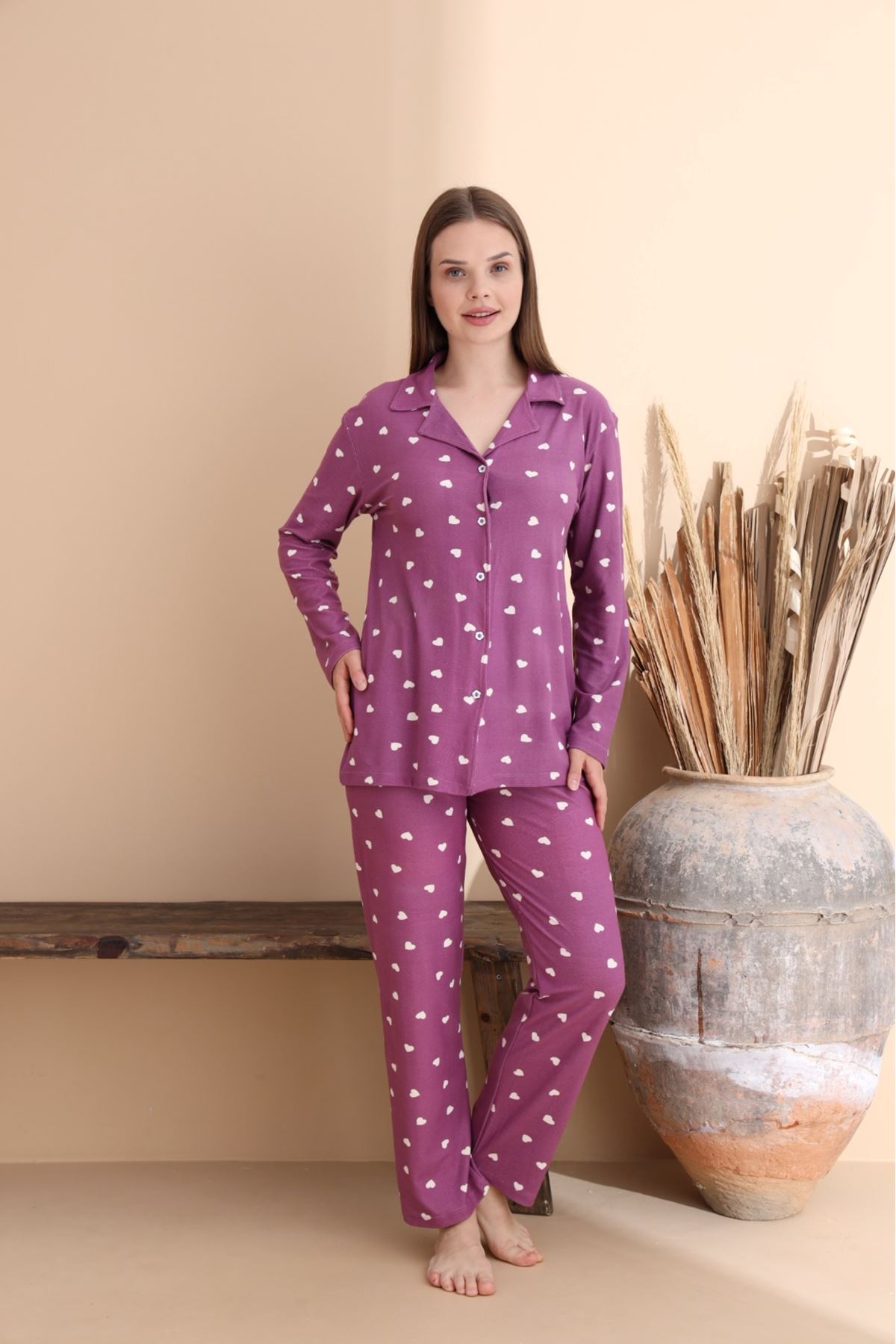 Kadın Mor Desenli Süet Gömlek Yaka Yumuşak Uzun Kol Kışlık Pijama Takım 1D-2354