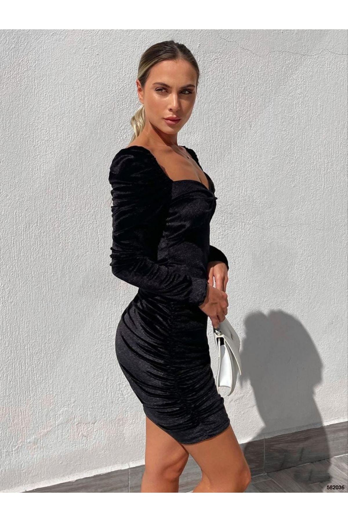 Kadın Siyah Kalp Yaka Kadife Uzun Kol Mini Elbise 12D-2307