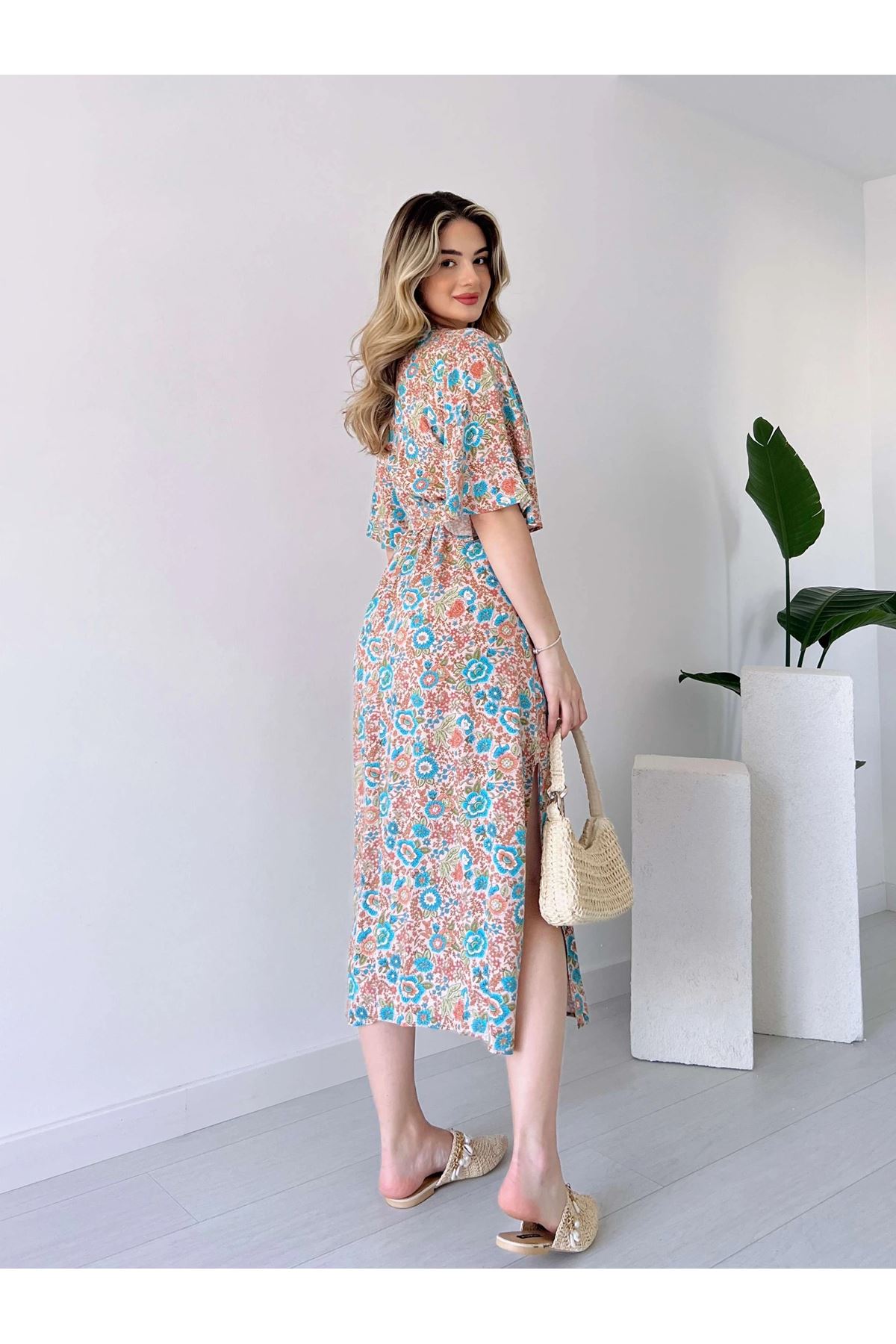 Kadın Yazlık Kruvaze Yaka Desenli Bilek Boy Yırtmaçlı Elbise 13E-2231
