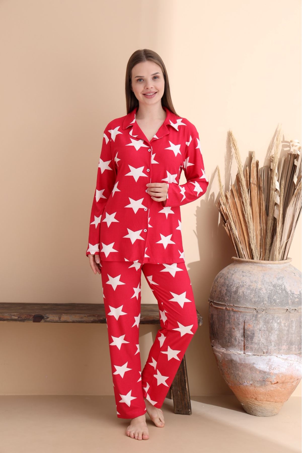 Kadın Yıldız Desenli Süet Gömlek Yaka Yumuşak Uzun Kol Kışlık Pijama Takım 1D-2353